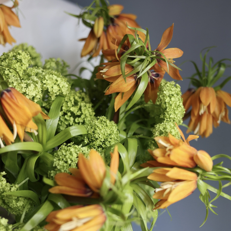 В авторских букетах тюльпаны часто собирают с нарциссами, вибурнумом, фритиллярией (она же рябчик) или легкими акцентами вроде маттиолы или дельфиниума. Такой букет выглядит не как «8 марта», а как продуманная композиция.