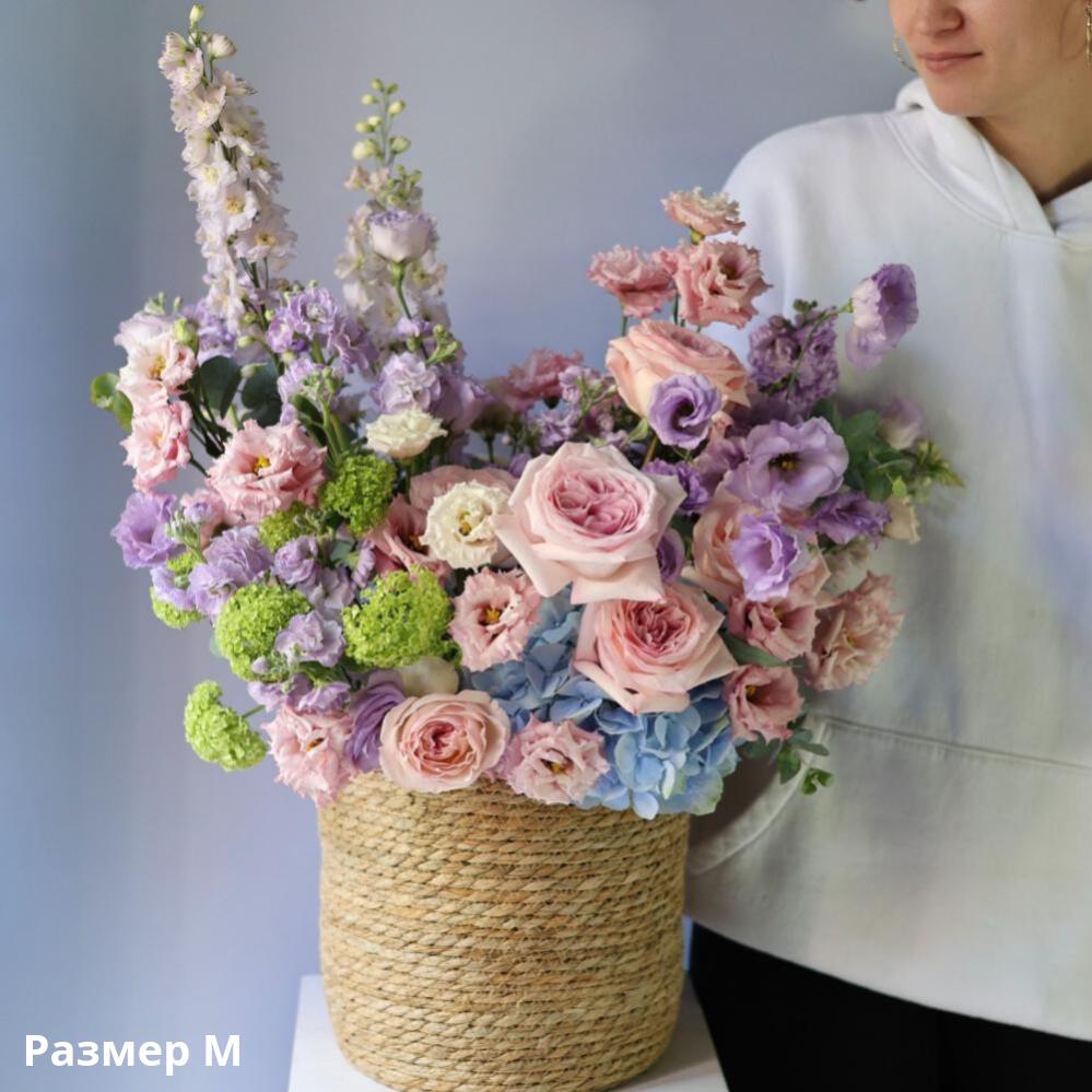 Также цвет и форма корзины могут отличаться от примера на фото. Мы можем прислать вам фото корзин на выбор перед сборкой композиции – для этого попросите об этом нашего менеджера при оформлении заказа.Бонусы за каждый букет