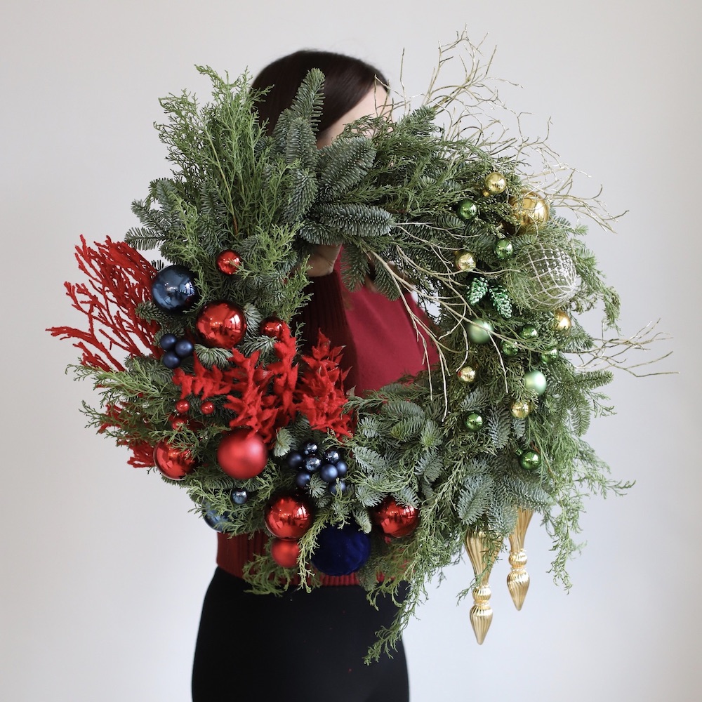 • Натуральные элементы: Комбинация натуральных веток хвои и ярких украшений делает венок стильным и экологичным.