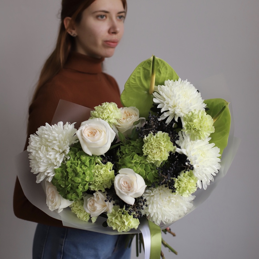 У букетов комплиментов постоянный состав, и вы заранее знаете, как будет выглядеть готовый букет. Конечно, цветы — не машинное производство, а живой организм, поэтому даже с постоянным составом букеты не выглядят абсолютно одинаково, но всё же результат будет близок к букету на фото.