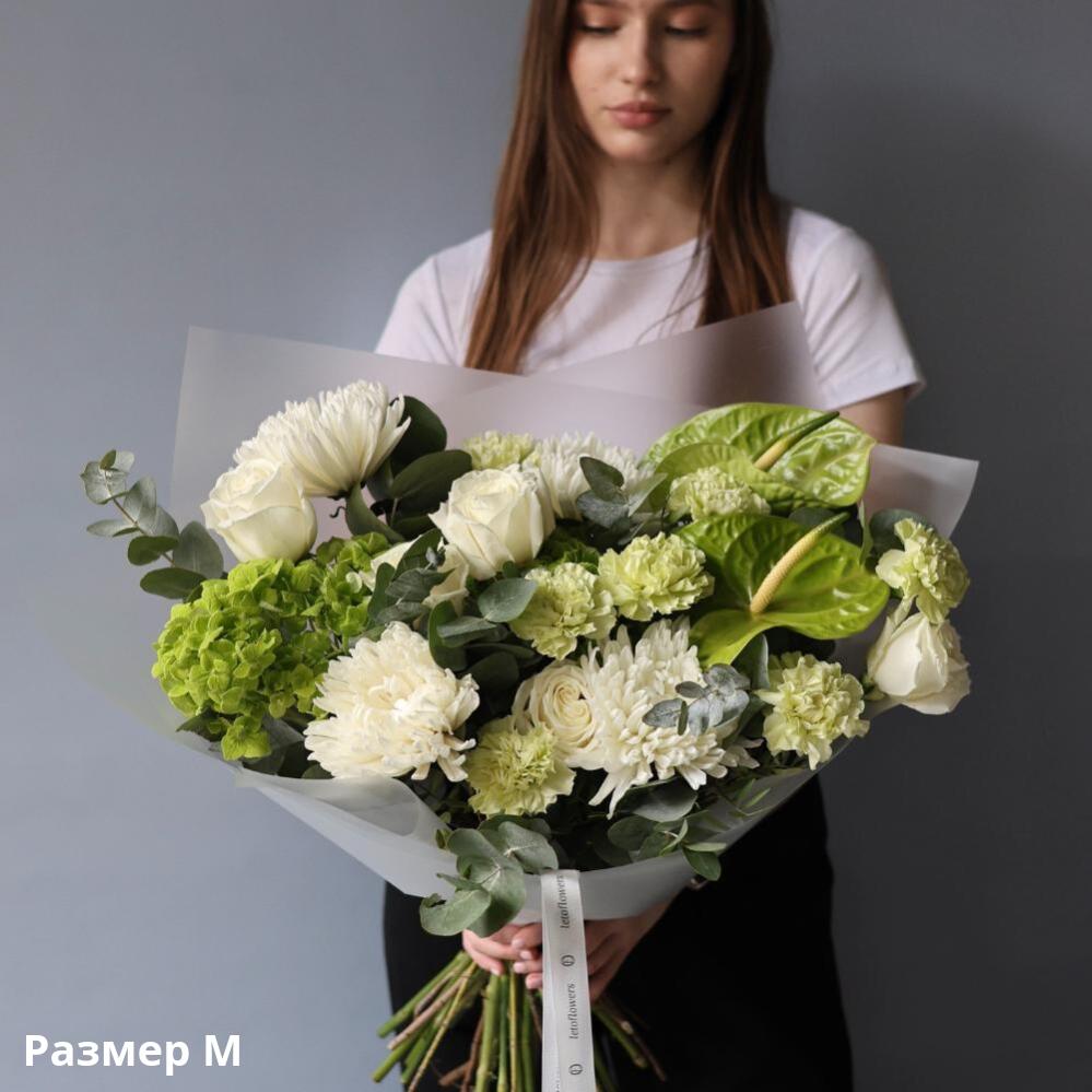 У букетов комплиментов постоянный состав, и вы заранее знаете, как будет выглядеть готовый букет. Конечно, цветы — не машинное производство, а живой организм, поэтому даже с постоянным составом букеты не выглядят абсолютно одинаково, но всё же результат будет близок к букету на фото.