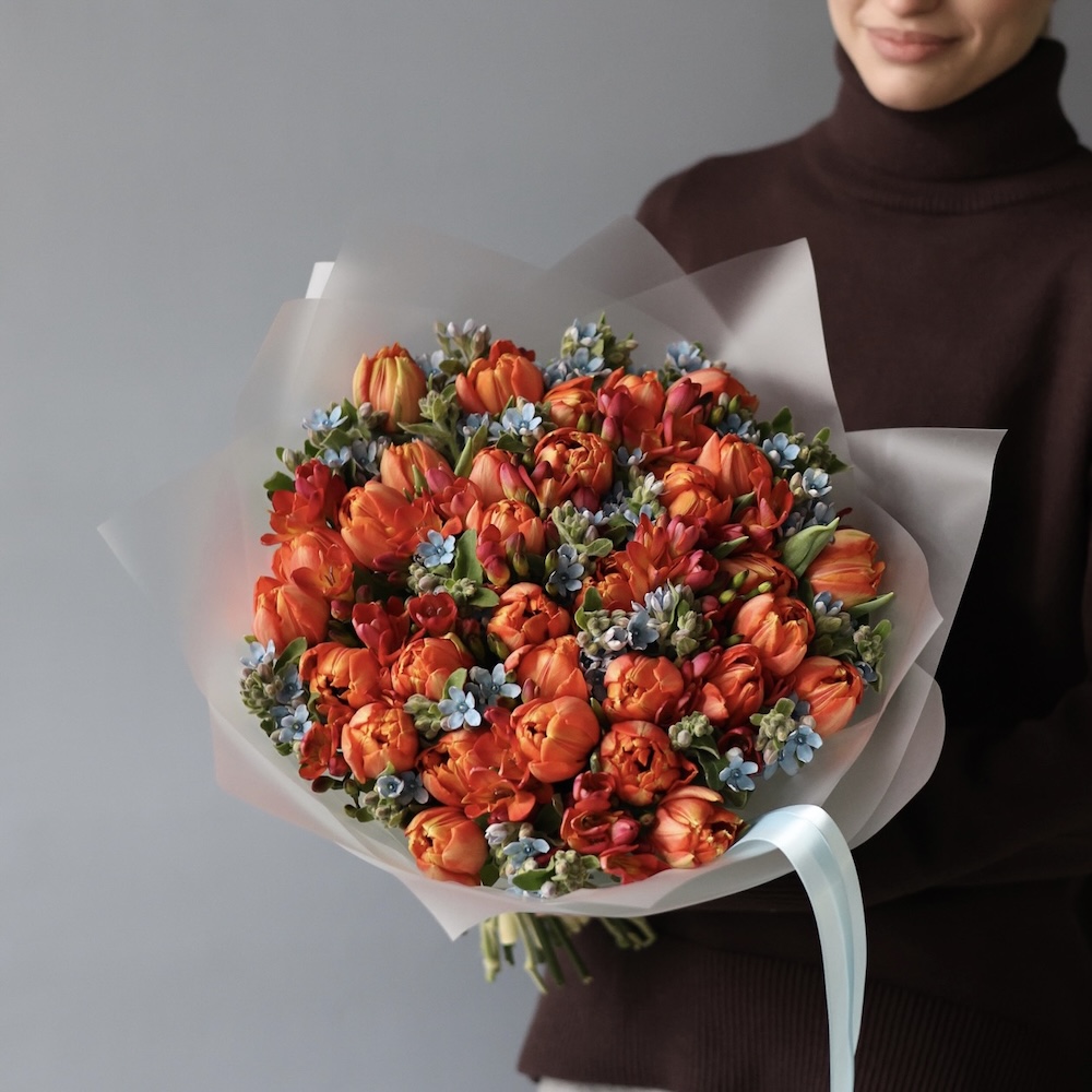 Пионовидные тюльпаны придают композиции глубину и выразительность, оксипеталум добавляет лёгкости и прохладного оттенка, а фрезия наполняет букет тонким свежим ароматом. Такое сочетание смотрится современно, но остаётся по-настоящему цветочным и тёплым.