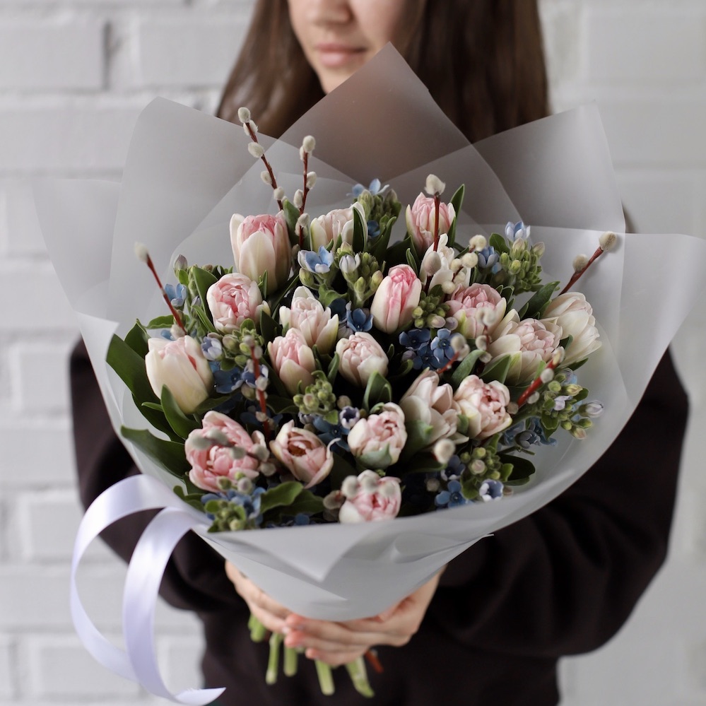 Букет из тюльпанов, оксипеталума и вербы