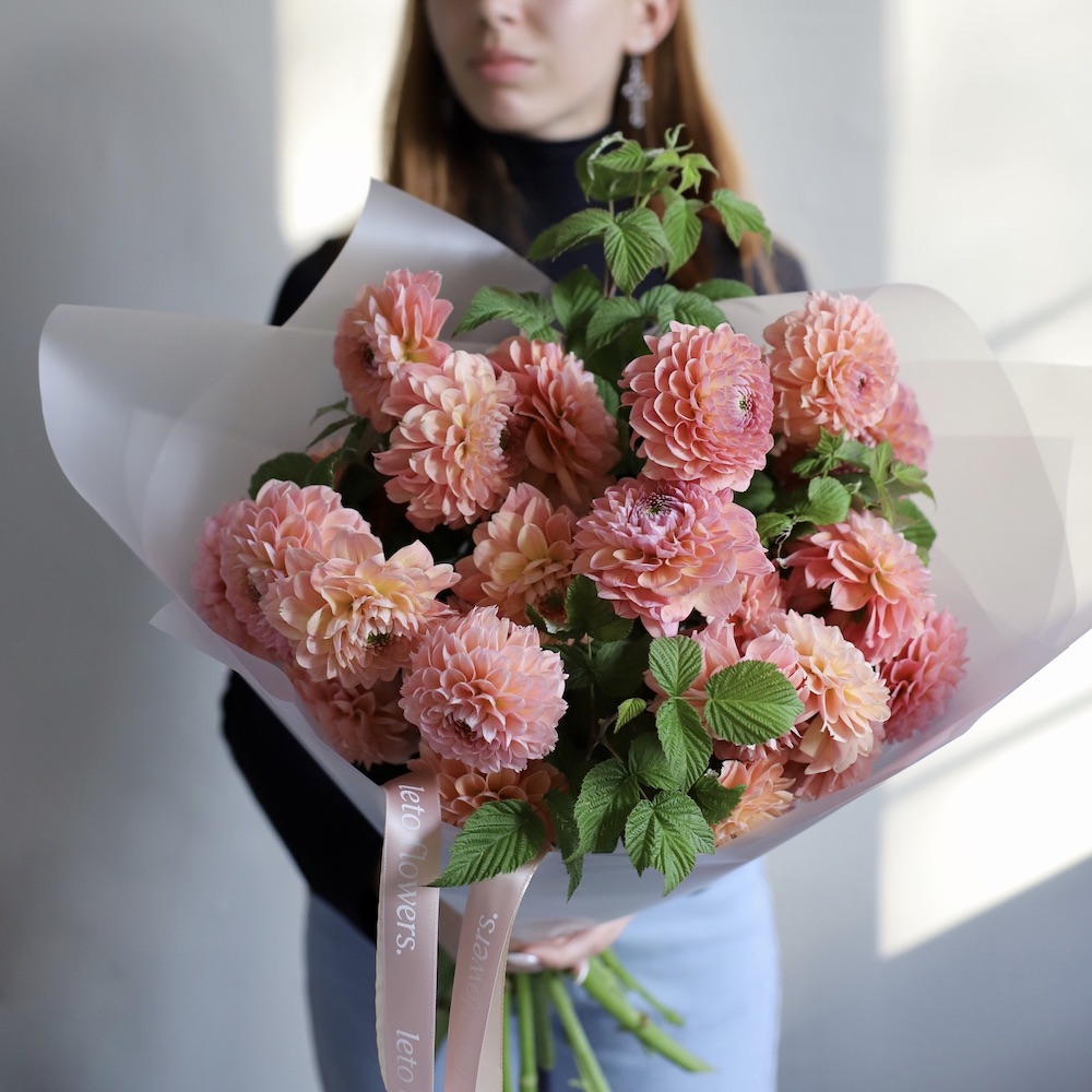 - цветом лент и зеленью. Флорист подберет ленты и зелень, которые лучше всего сочетаются именно с вашим букетом. Если у вас есть пожелания на этот счет, мы учтем их.