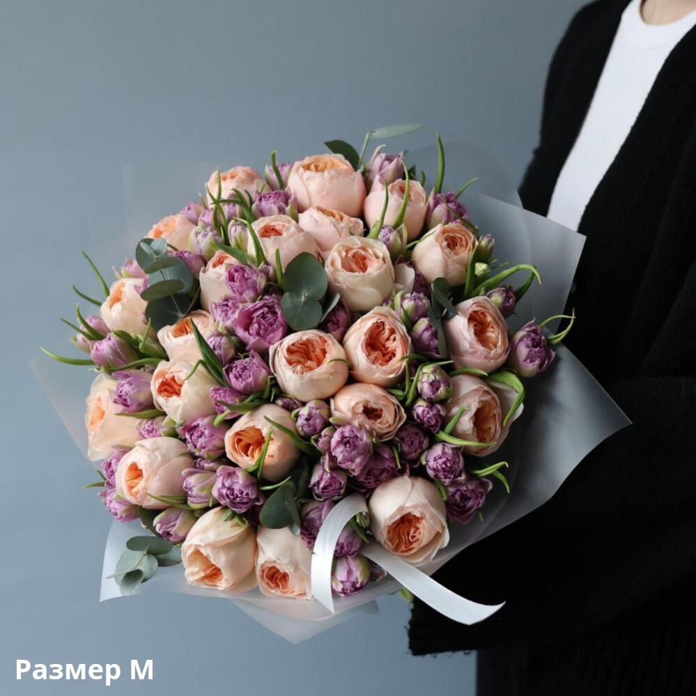 Букет из пионовидных роз и тюльпанов