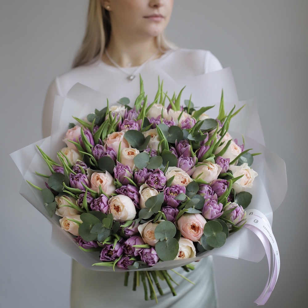 M 50 тюльпанов + 23 пионовидных роз + зелень