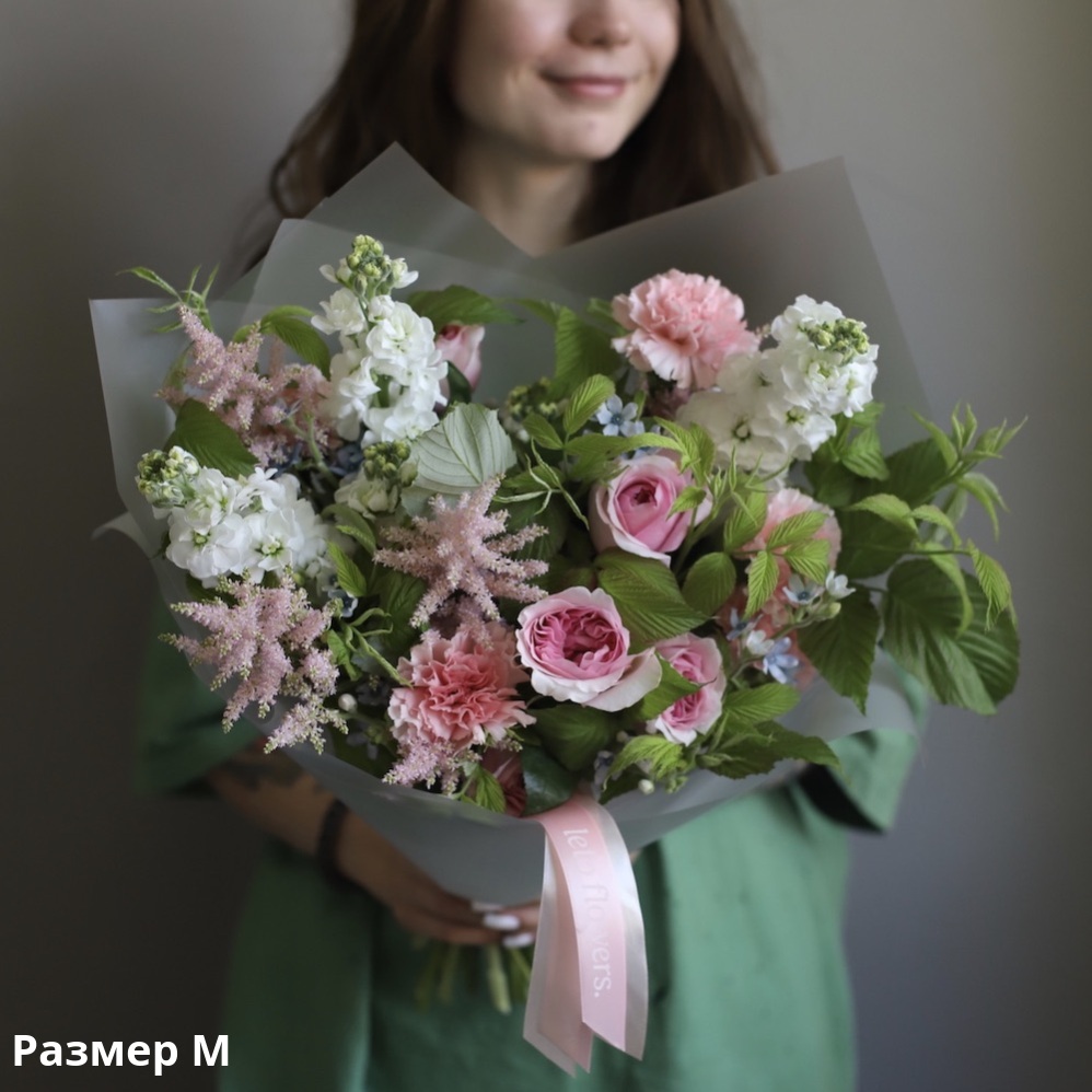 У букетов комплиментов постоянный состав, и вы заранее знаете, как будет выглядеть готовый букет. Конечно, цветы — не машинное производство, а живой организм, поэтому даже с постоянным составом букеты не выглядят абсолютно одинаково, но всё же результат будет близок к букету на фото.