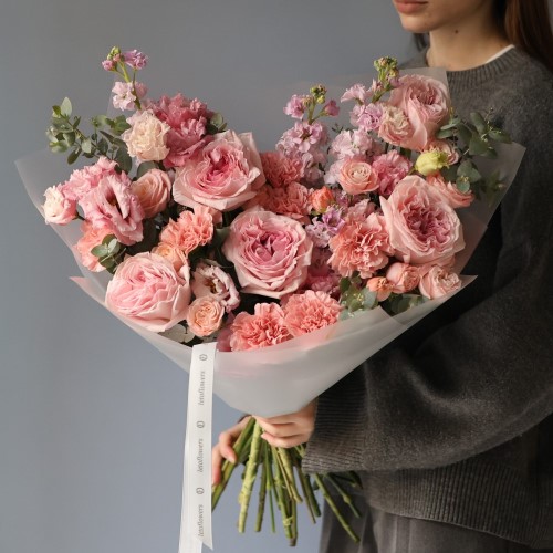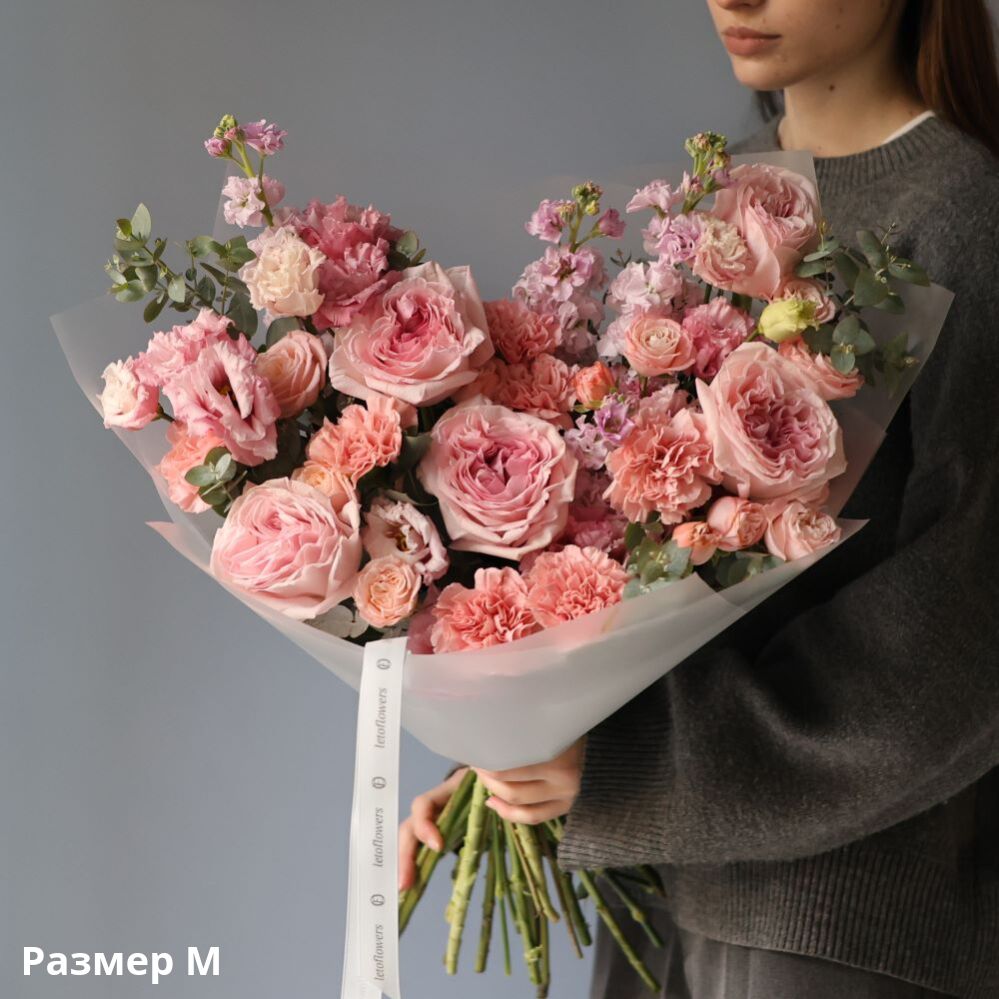 У букетов комплиментов постоянный состав, и вы заранее знаете, как будет выглядеть готовый букет. Конечно, цветы — не машинное производство, а живой организм, поэтому даже с постоянным составом букеты не выглядят абсолютно одинаково, но всё же результат будет близок к букету на фото.