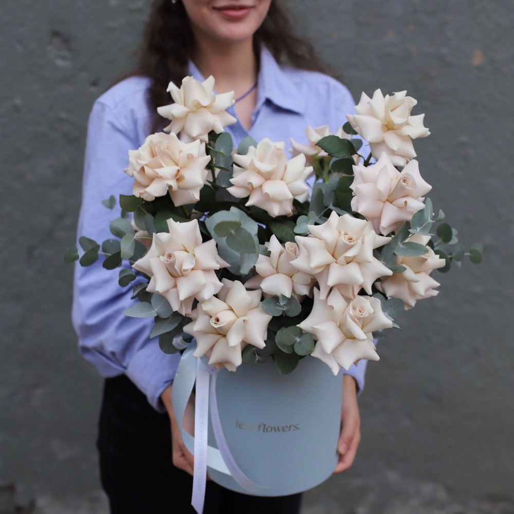 Шляпная коробка смотрится стильно и позволит не беспокоиться подбором подходящей вазы.