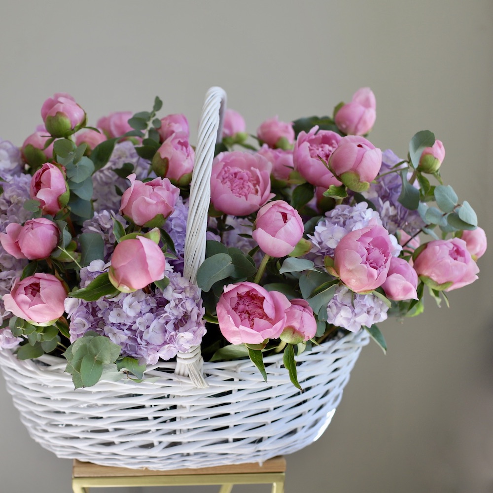Корзина с пионами и гортензией