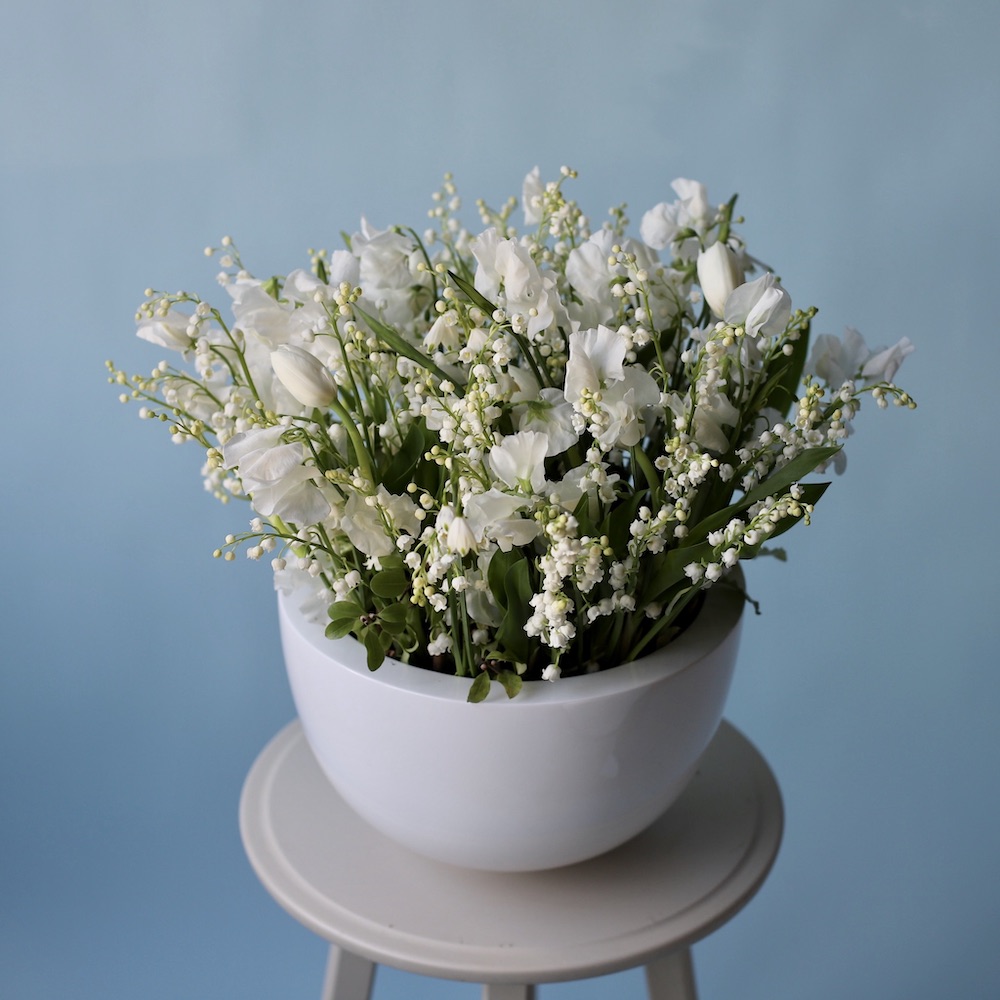 Ландыши – это некрупные и достаточно дорогие цветы. Композиция в размере S из 25 ландышей и весенних цветов будет миниатюрной, около 15-20 см в диаметре.