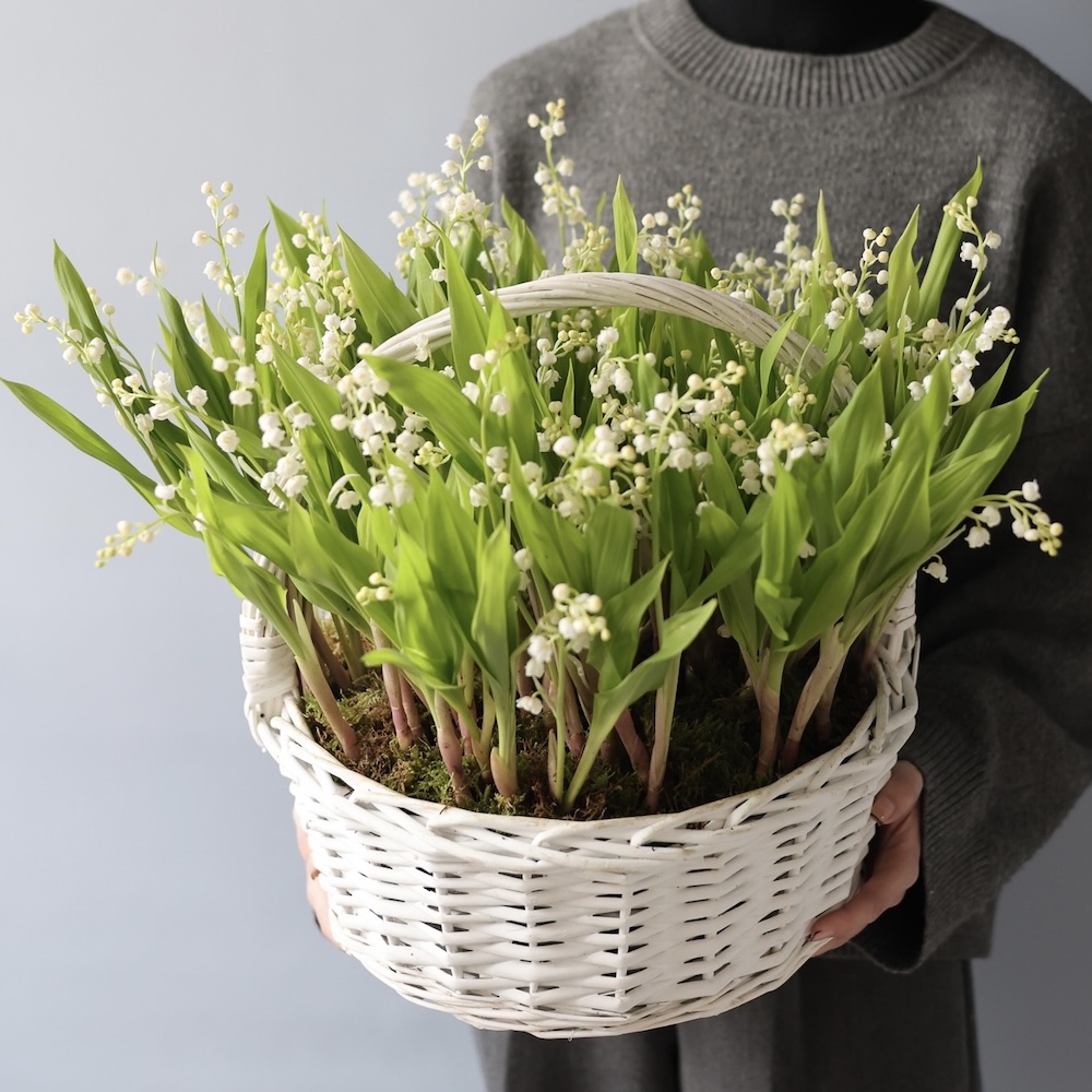 Ландыши – это некрупные и достаточно дорогие цветы. Корзина в размере M из 49 ландышей будет миниатюрной, около 20 см в диаметре.