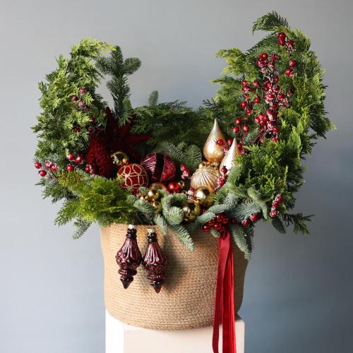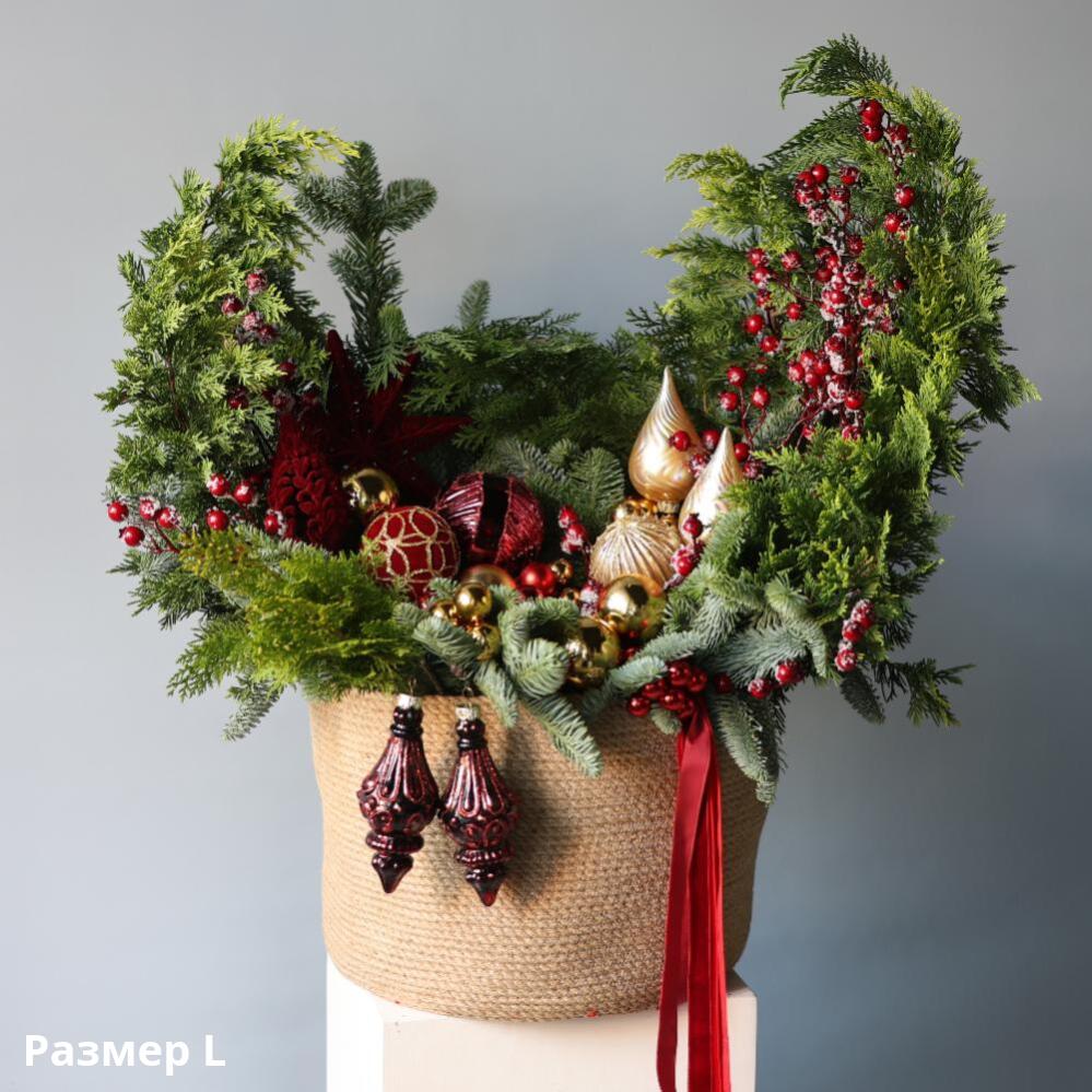 • Качество материалов: Использованы только натуральные ветки хвои, декорированные праздничными шарами, гирляндами и ягодами.
