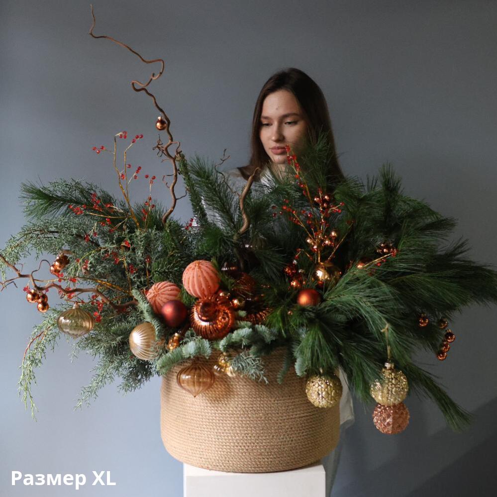 2. В основе вашей композиции флористическая губка. Хвоя пьет из нее воду, чтобы оставаться свежей. Губка всегда должна быть влажной (можно отодвинуть веточки и потрогать губку рукой).
