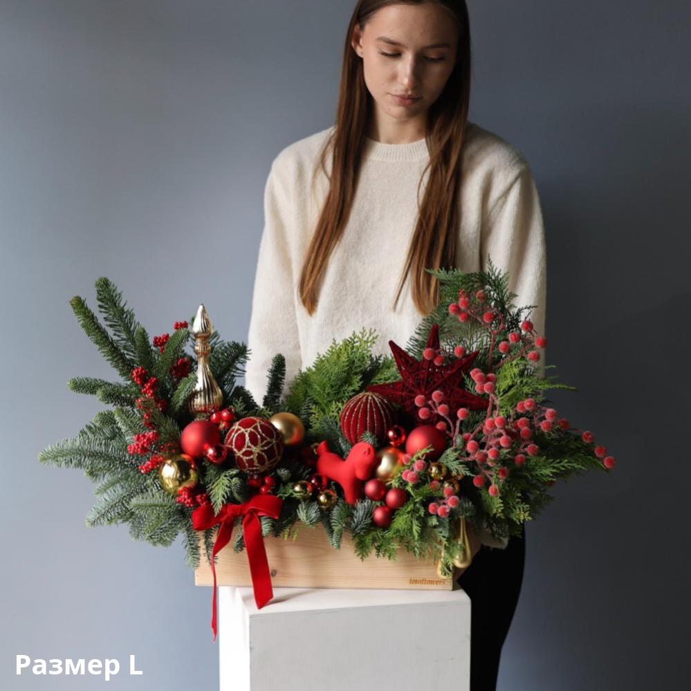 Композиции в ящиках смотрятся эффектно независимо от своего размера. Хвоя, декор и дерево идеально сочетаются, создавая атмосферу праздника и волшебства. Максимально удобны в уходе: поливайте композицию и она долго сохранит свежесть. Большая композиция послужит великолепным декором не только домашнего интерьера, но и праздничного мероприятия.